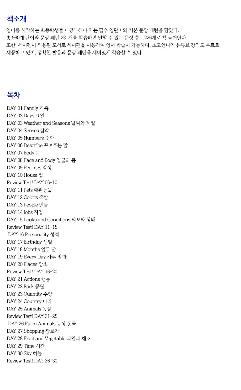 | 도서명 | [쎄듀] 패턴으로 말하는 초등 필수 영단어 1 | 저자, 출판사 | 김기훈 , 쎄듀영어교육연구센터 / 쎄듀 |