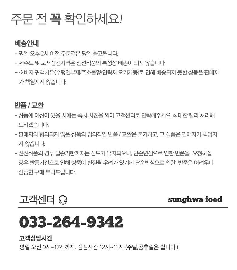 | 배송방법 | 신선/냉장/냉동 | 배송비 | 무료배송 - 도서산간 지역 배송불가 |