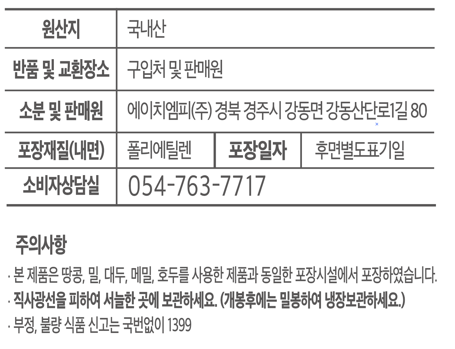 | 생산자(수입자) | 에이치엠피(주) / 경북 경주시 강동면 강동산단로1길 80 | 원산지 | 컨텐츠 참조 |
