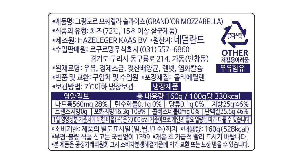 그랑도르에서 만들어 진득한 모짜렐라 치즈를 만나보세요. 본연의 고소하면서도 담백한 맛이 참 진해요. 슬라이스 형태로 되어 있어 다양한 요리에 활용하기에도 간편한데요. 부드럽고 촉촉하게 입안을 감싸며 녹아드는 모짜렐라의 맛있는 매력을 즐길 수 있답니다. 그라탕, 샌드위치 등 다양한 곳에 넣어 나만의 요리를 만들어보세요. 작게 잘라 카나페로 만들어도 좋아요.
