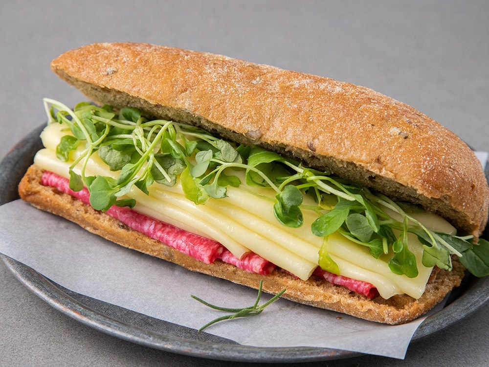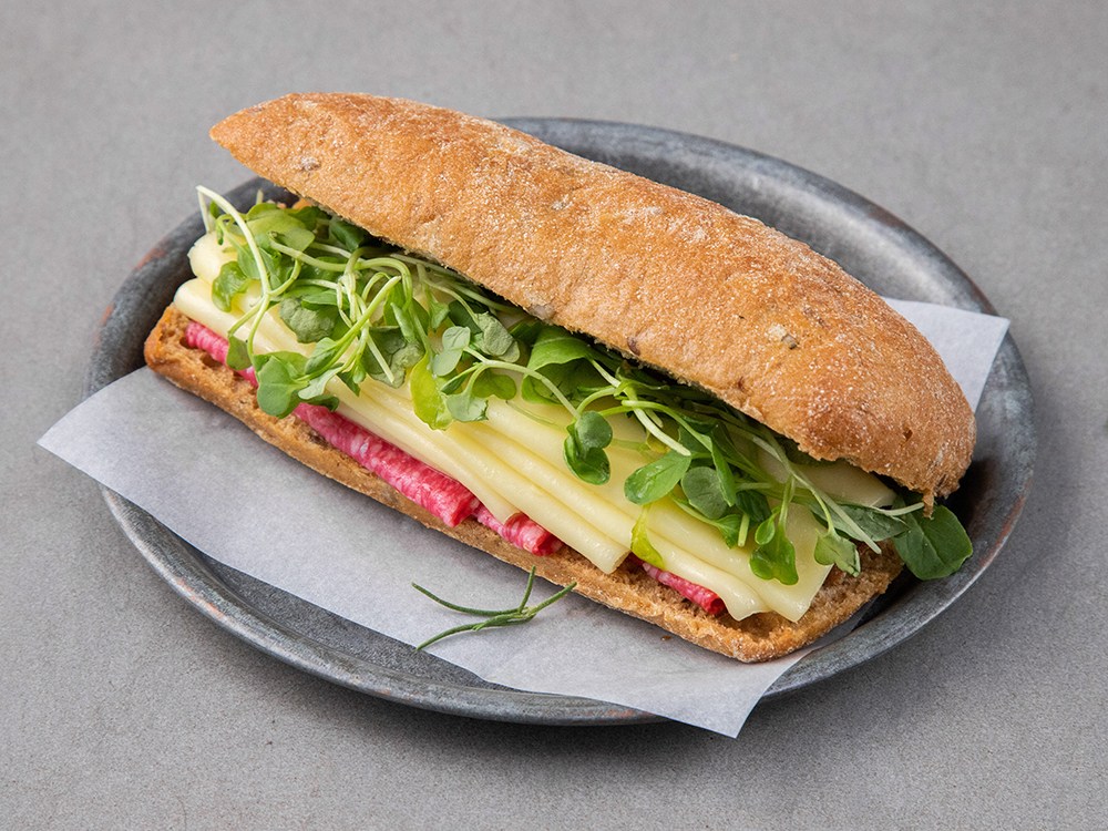재료: 호밀 치아바타, 모짜렐라 치즈, 살라미(다른 햄으로 변경 가능), 어린잎