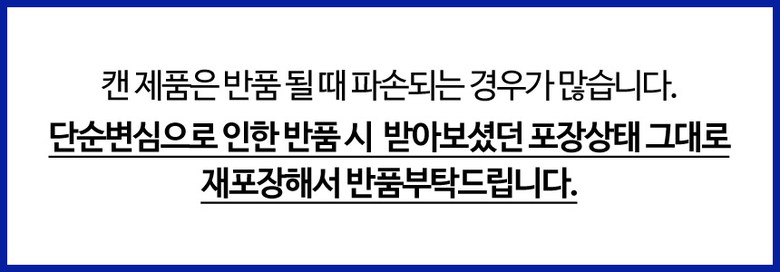 | 교환/반품 신청 기준일 | ㆍ단순변심에 의한 교환/반품은 제품 수령 후 7일 이내까지, 교환/반품 제한사항에 해당하지 않는 경우에만 가능 (배송비용과 교환/반품 비용 왕복배송비 고객부담) ㆍ상품의 내용이 표시·광고의 내용과 다른 경우에는 상품을 수령한 날부터 3개월 이내, 그 사실을 안 날 또는 알 수 있었던 날부터 |