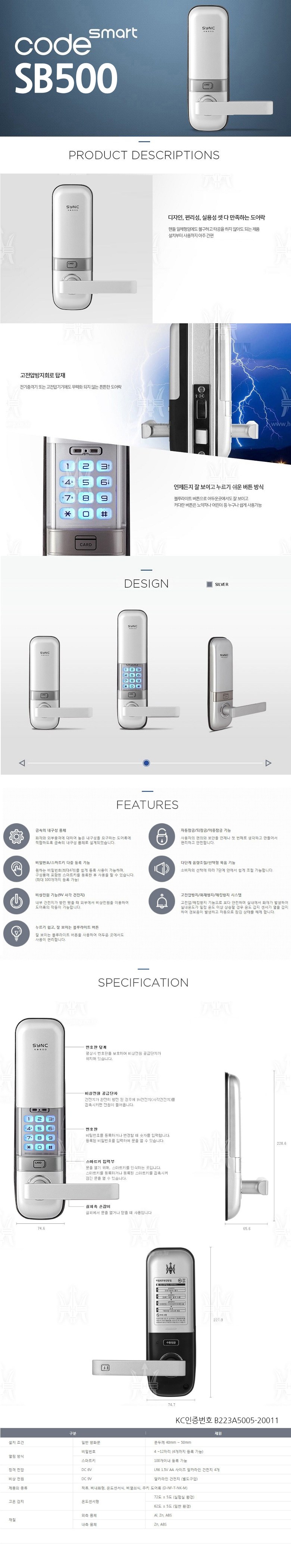 | 품명 및 모델명 | 혜강 코드스마트 디지털도어락 + 카드키 | KC 인증정보 | 본품: B223A5005-20011, MSIP-CMM-HG0-CODESMART-E / 건전지: B052R346-6001 |