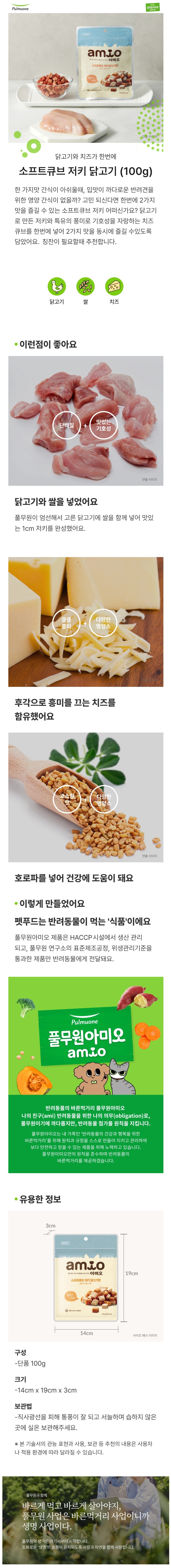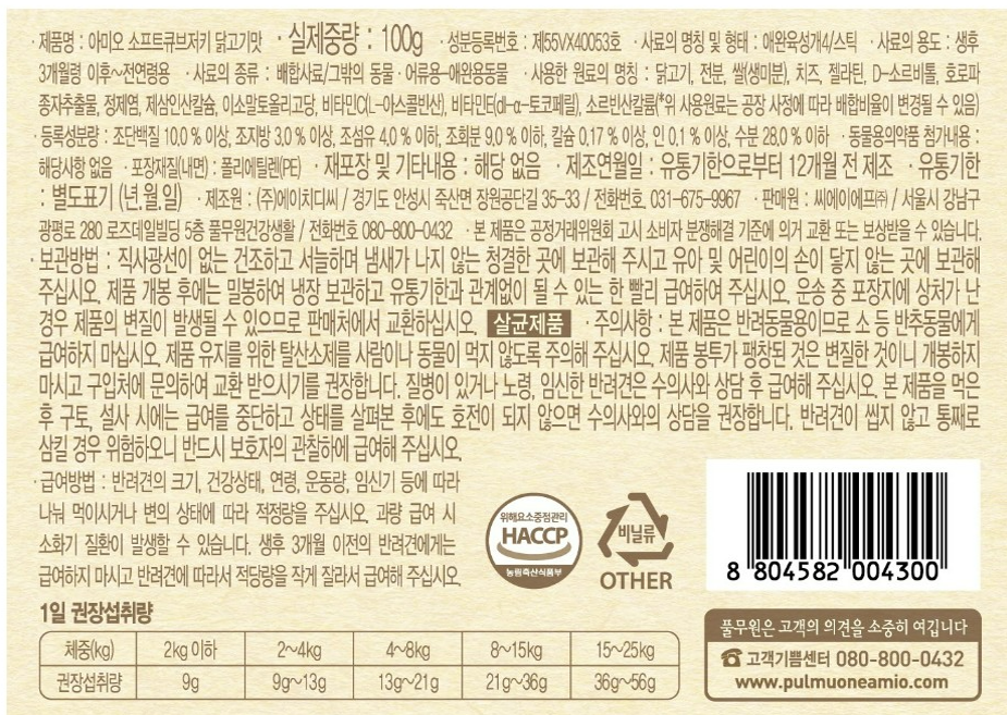 | 품명 및 모델명 | 아미오 소프트 큐브 저키 닭고기맛 | 인증/허가 사항 | 사료관리법에 따른 성분등록번호 : 컨텐츠 참조 |