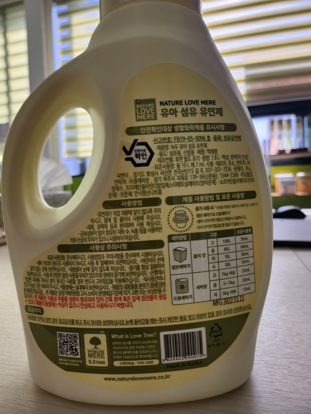 | 품목 및 제품명 | 섬유유연제/녹두 유아섬유유연제 | 용도(표백제의 경우 계열을 함께표시) 및 제형 | 신발용,섬유용/비분사형-액체형 |