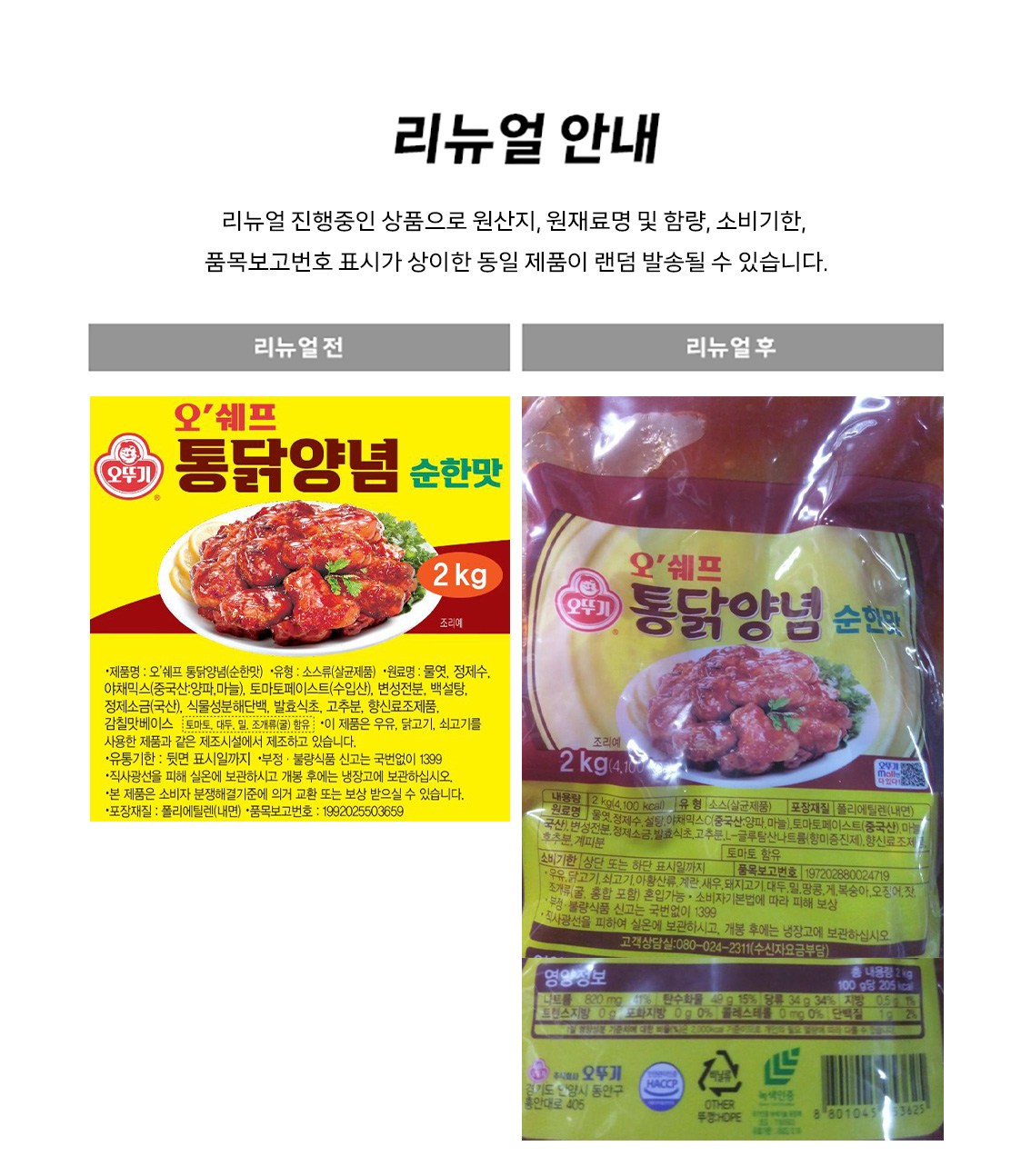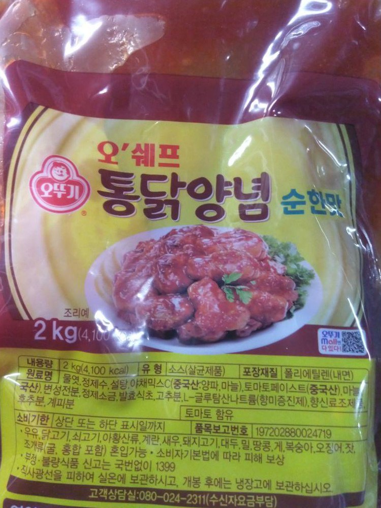 | 제품명 | 오쉐프 통닭양념 (순한맛) | 식품의 유형 | 소스류(살균제품) |