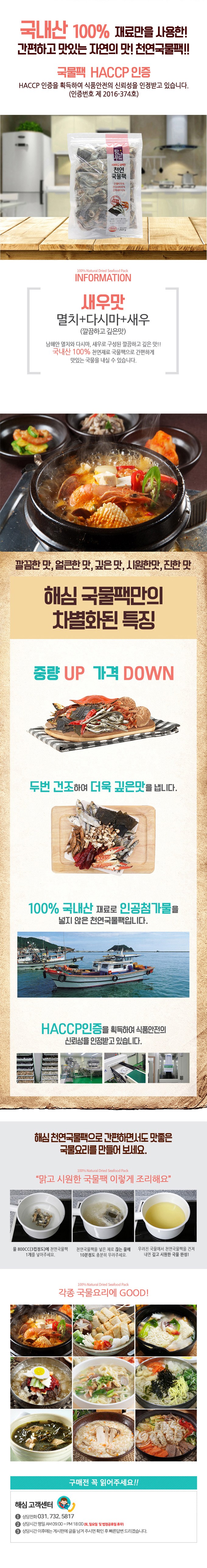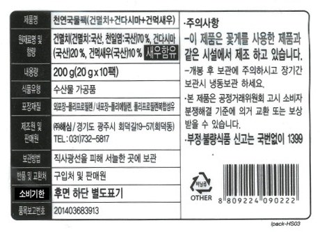 | 제품명 | 천연국물팩(건멸치+건다시마+건먹새우) | 식품의 유형 | 수산물가공품 |