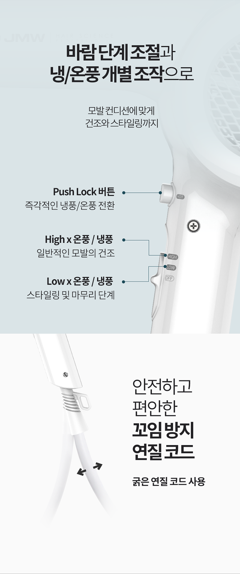 - 푸쉬락 버튼이 있어 냉풍, 온풍 기능으로 쉽게 변경