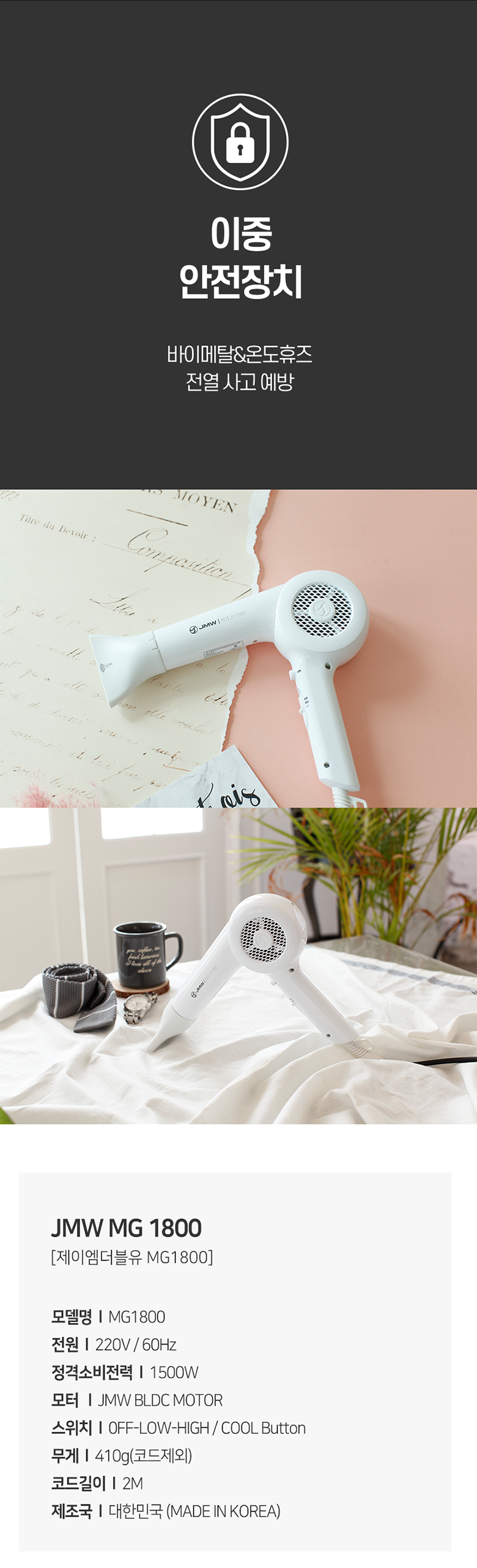 | 품명 및 모델명 | JMW 항공모터 드라이기 / MG1800 (MG1800-18) | KC 인증정보 | JH07496-17001R / MSIP-REM-JMW-MS6000 |