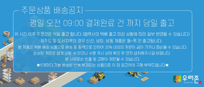 | 배송기간 | ㆍ도서산간 지역 등은 배송에 3-5일이 더 소요될 수 있습니다. - 천재지변, 물량 수급 변동 등 예외적인 사유 발생 시, 다소 지연될 수 있는 점 양해 부탁드립니다. | ||