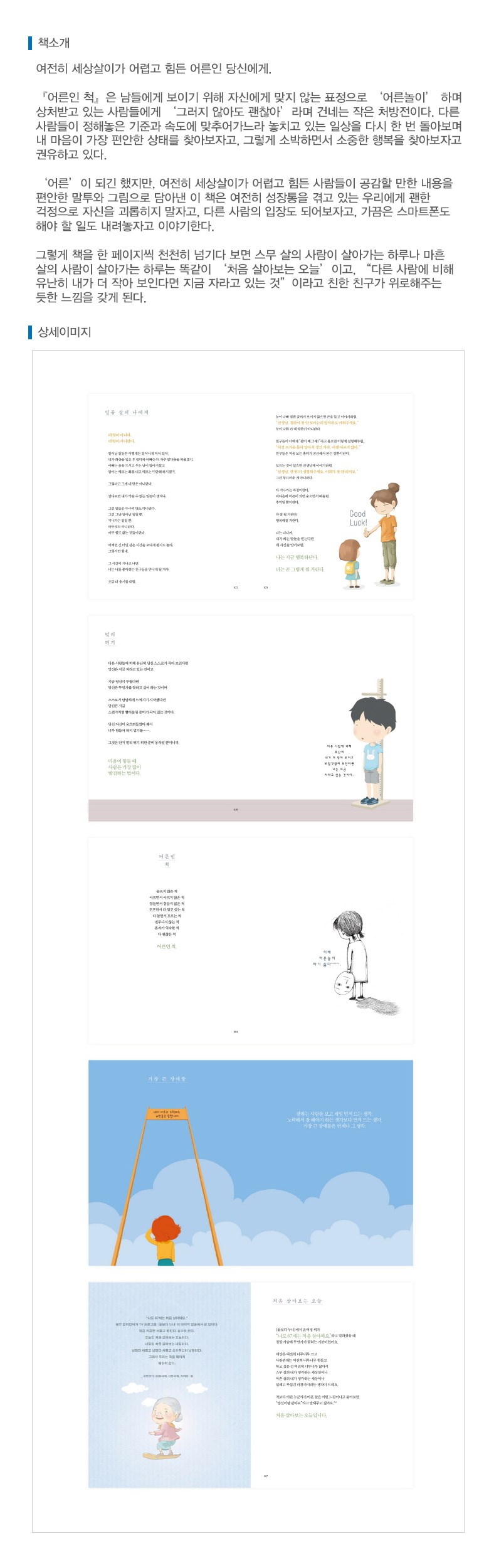 《어른인 척》은 ‘어른’이 되긴 했지만 여전히 세상살이가 어렵고 힘든 사람들이 공감할 만한 내용을 편안한 말투와 그림으로 보이고 있다. 여전히 성장통을 겪고 있는 우리에게 괜한 걱정으로 자신을 괴롭히지 말자고, 다른 사람의 입장도 되어보자고, 가끔은 스마트폰도 해야 할 일도 내려놓자고 이야기한다. 그렇게 이 책을 한 페이지씩 천천히 넘기다보면 스무 살의 사람이 살아가는 하루나 마흔 살의 사람이 살아가는 하루는 똑같이 ‘처음 살아보는 오늘’이고, “다른 사람에 비해 유난히 내가 더 작아 보인다면 지금 자라고 있는 것”이라고 친한 친구가 위로해주는 듯한 느낌을 갖게 된다.