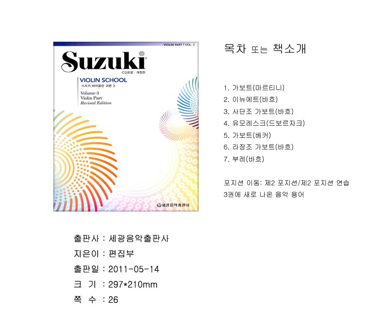| 도서명 | [세광]스즈키 바이올린 교본 3 개정판 | 저자, 출판사 | 편집부,세광음악출판사 |