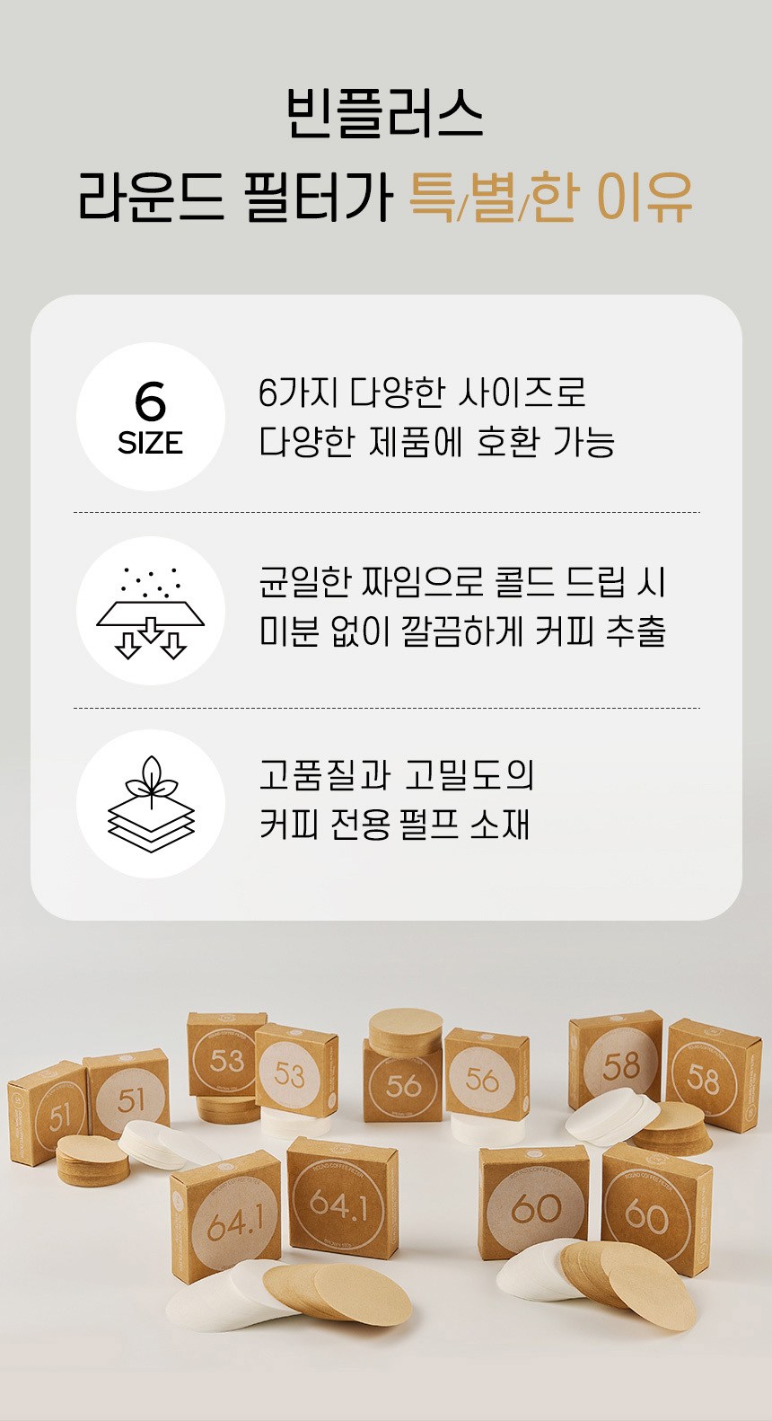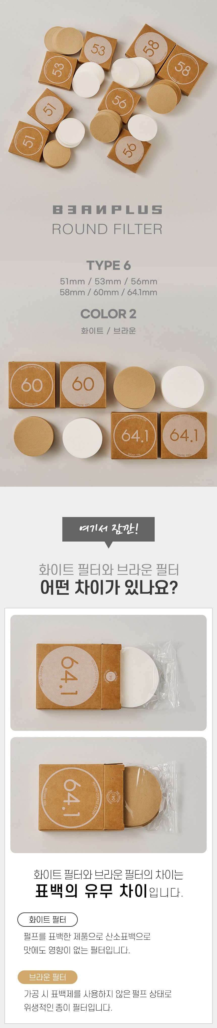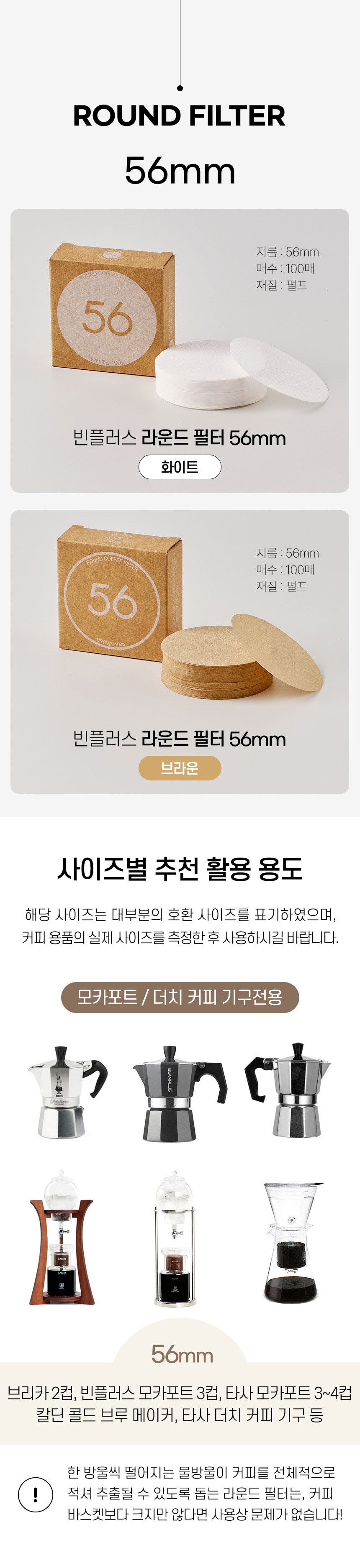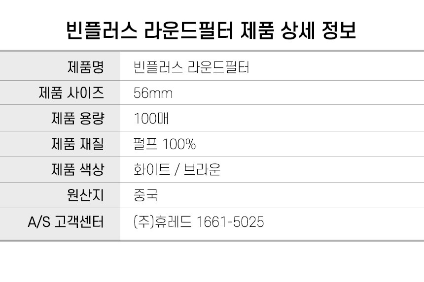 | 품명 및 모델명 | 빈플러스 라운드 원형 커피 필터 여과지 화이트 커피머신 포터필터 모카포트 페이퍼 56mm 100매 | 재질 | 종이제 |