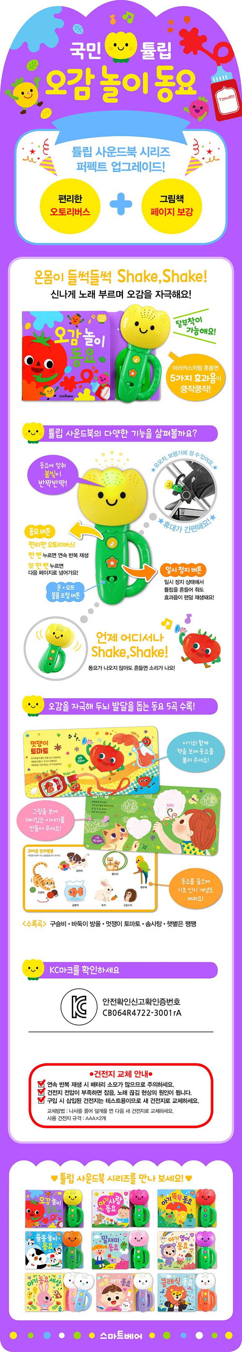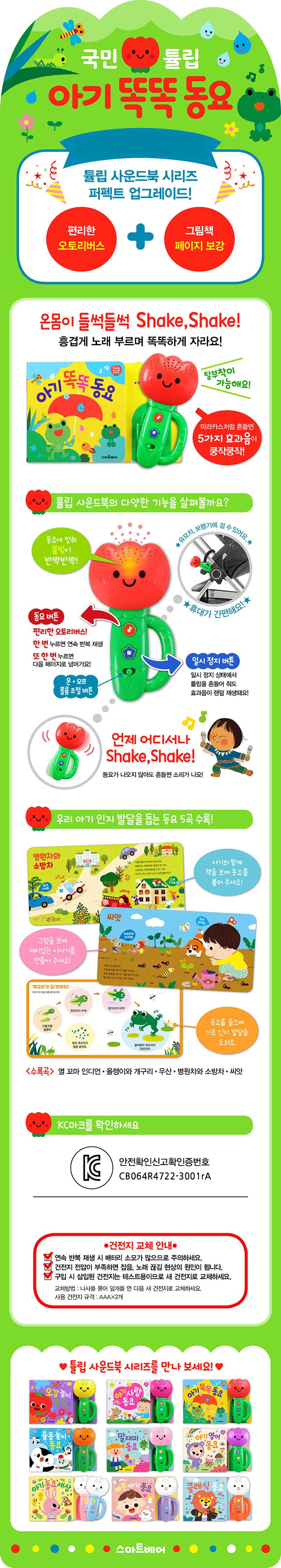 | 품명 및 모델명 | 튤립 사운드북 오감 놀이 동요 + 아기 똑똑 동요 세트, SB-T002 | KC 인증정보 | 본품: CB064R4722-3001rA, R-R-WSK-SB-T002 / 건전지: B053R120-2002 |