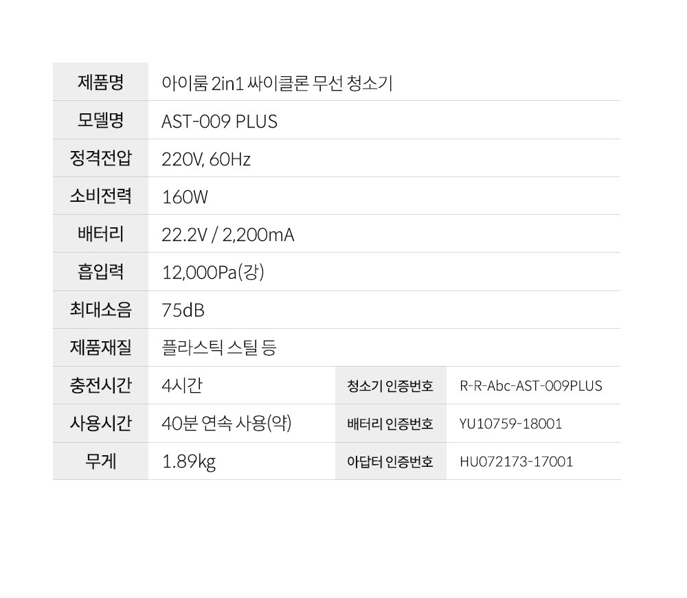 | 품명 및 모델명 | 아이룸 싸이클론 차이슨 무선청소기 / AST-009PLUS | KC 인증정보 | 본품: R-R-Abc-AST-009PLUS, 전지: YU10759-18001, 어댑터: HU072173-17001A, MSIP-REM-CZ9-RKGSDC2700667 |