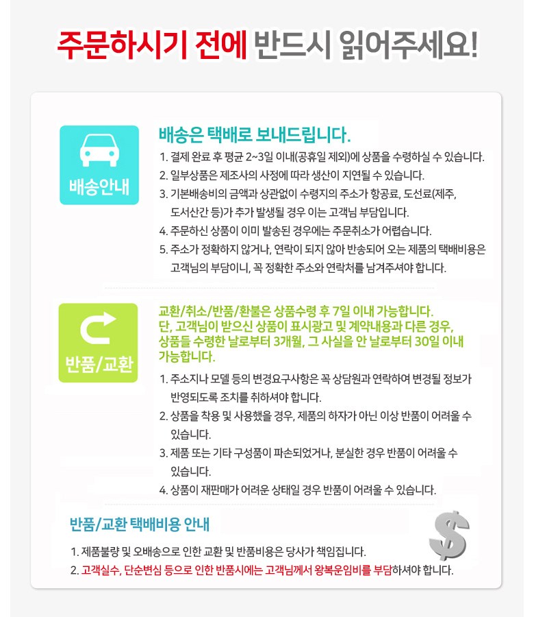 - ㆍ모니터 해상도의 차이로 인해 색상이나 이미지가 실제와 달라, 고객이 단순 변심으로 교환/반품을 무료로 요청하는 경우