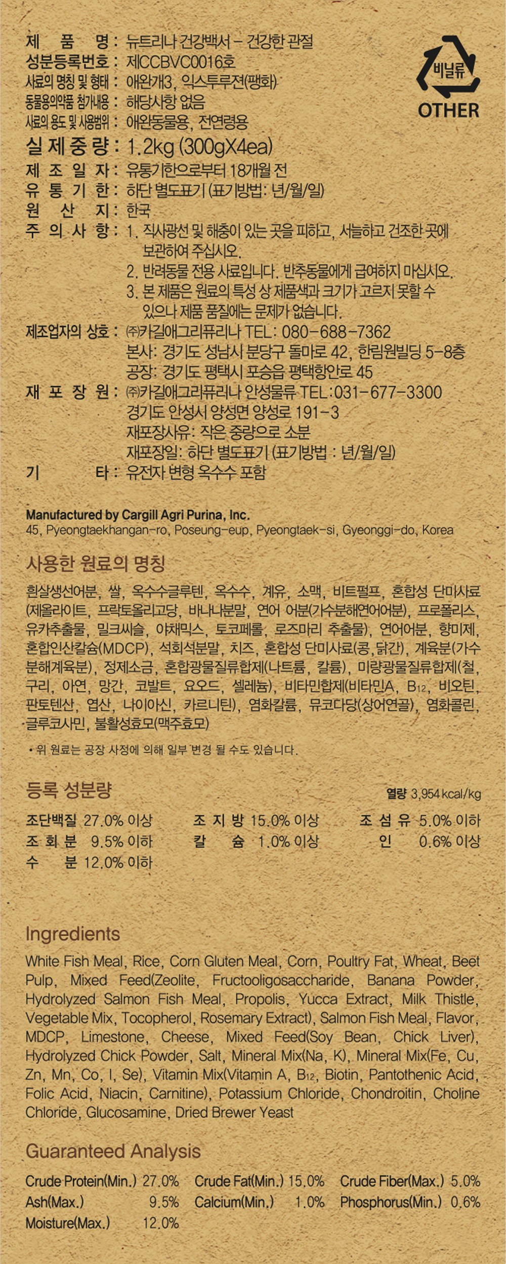 | 품명 및 모델명 | 뉴트리나 건강백서 - 건강한 관절 | 인증/허가 사항 | 사료관리법에 따른 성분등록번호: 컨텐츠참조 |