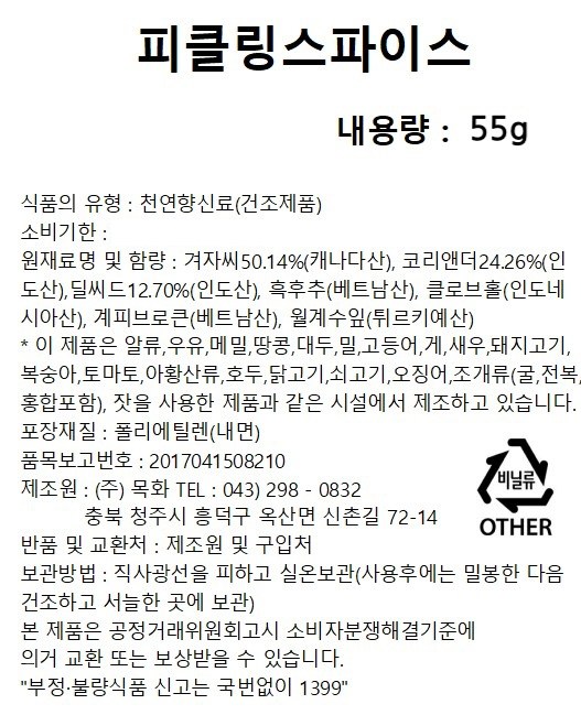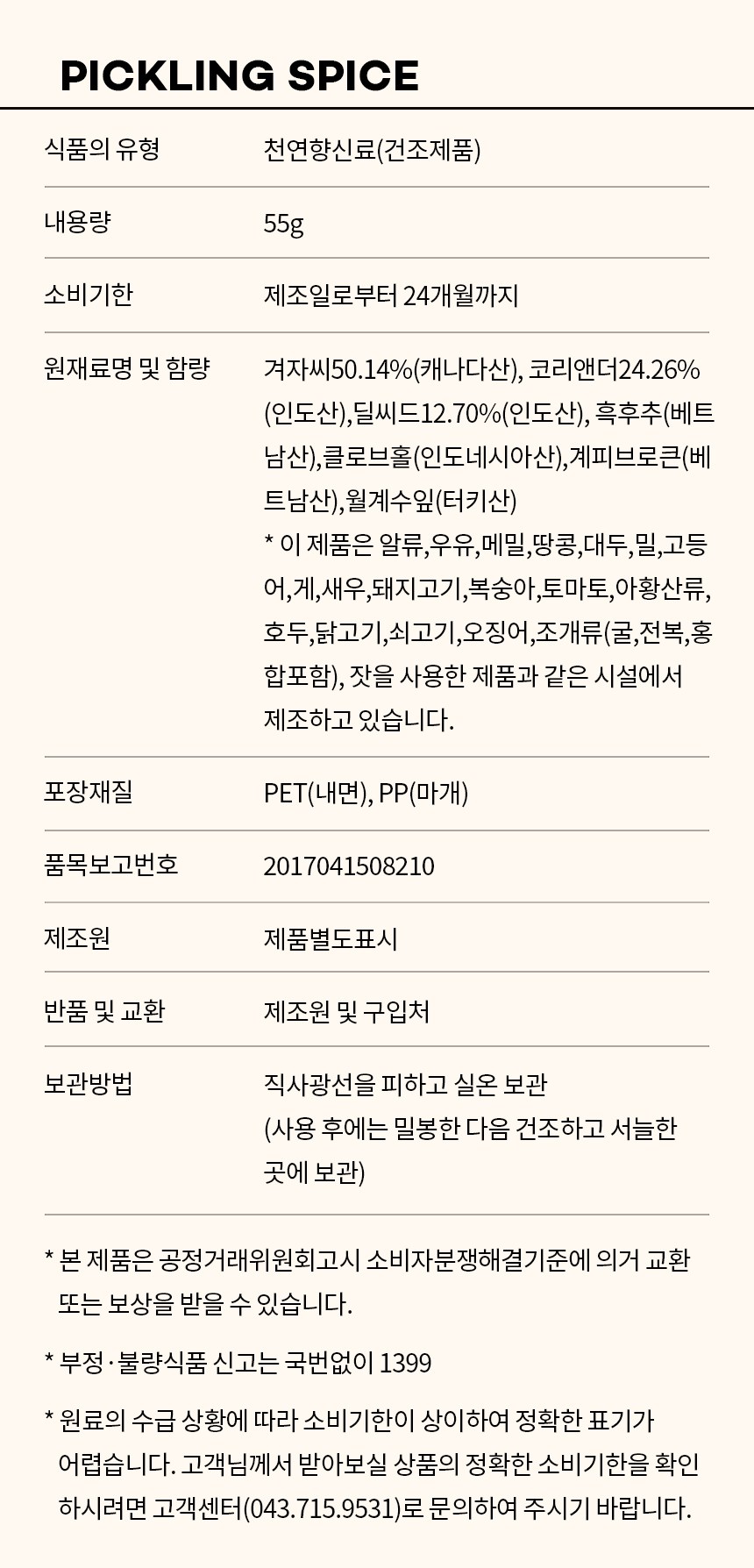 | 제품명 | 피클링스파이스 | 식품의 유형 | 천연향신료 |