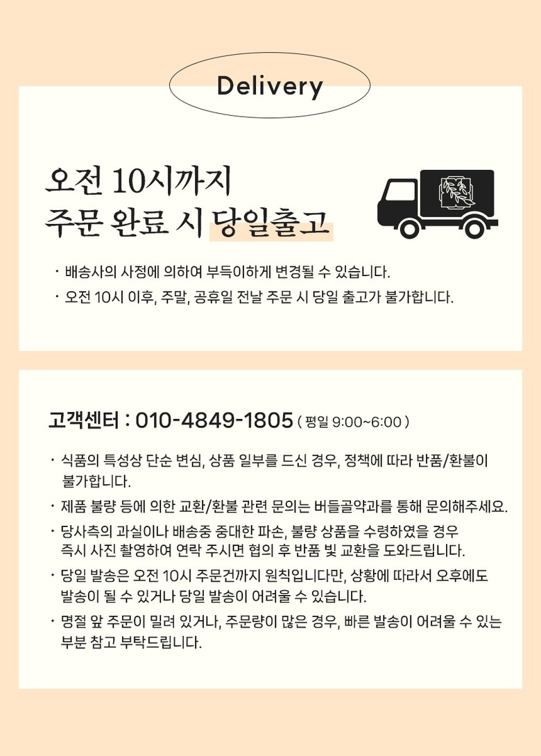 | 배송기간 | ㆍ도서산간 지역 등은 배송에 3-5일이 더 소요될 수 있습니다. - 천재지변, 물량 수급 변동 등 예외적인 사유 발생 시, 다소 지연될 수 있는 점 양해 부탁드립니다. | ||