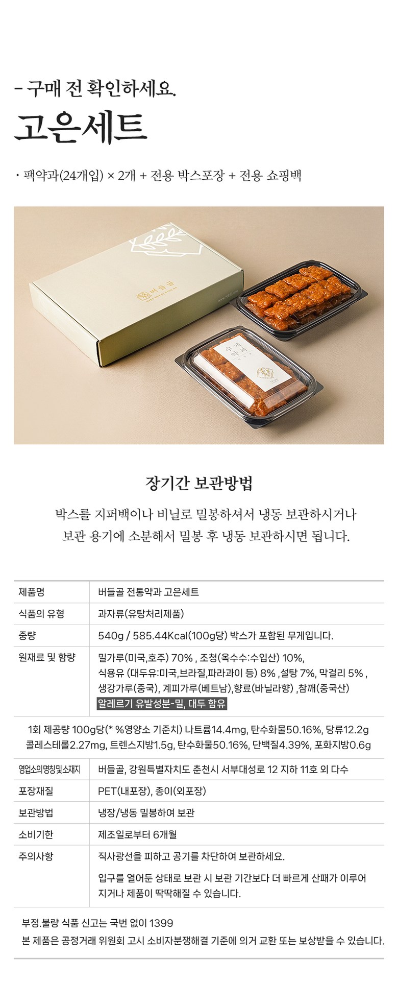 | 제품명 | 버들골 수제약과 고은세트 | 식품의 유형 | 식품의 유형:과자류(유탕처리제품) |