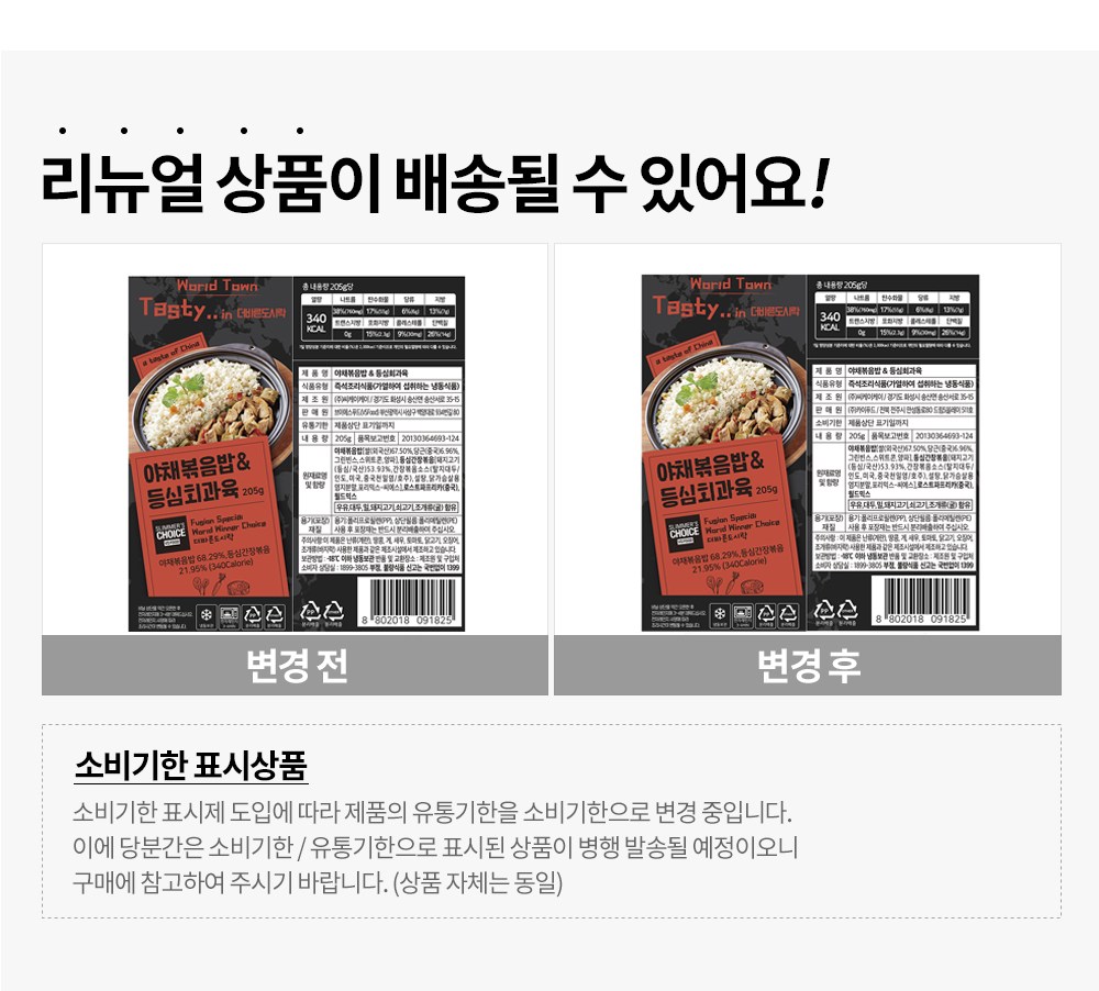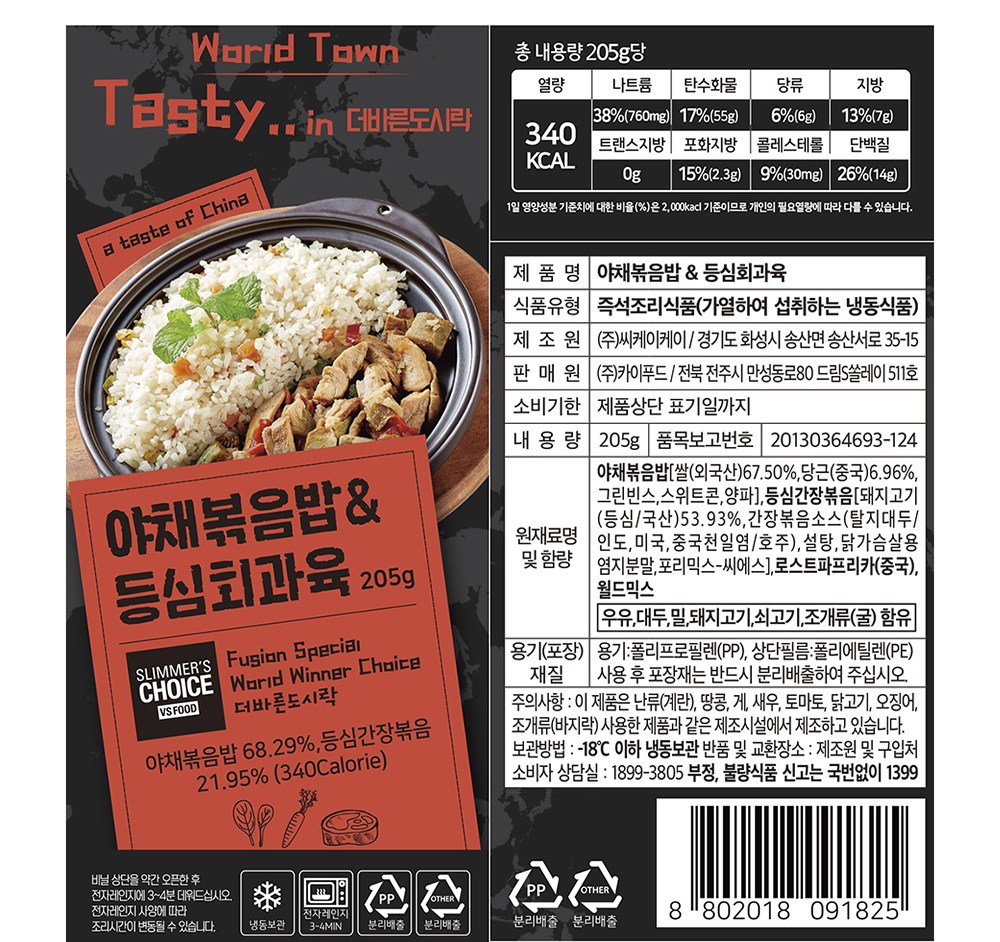 | 제품명 | 야채볶음밥&등심회과육 | 식품의 유형 | 즉석조리식품(가열하여 섭취하는 냉동식품) |