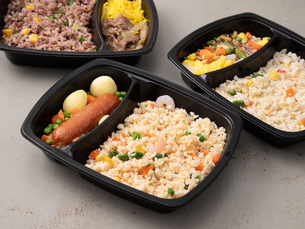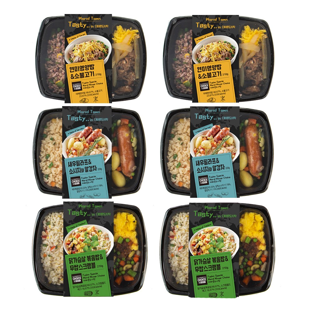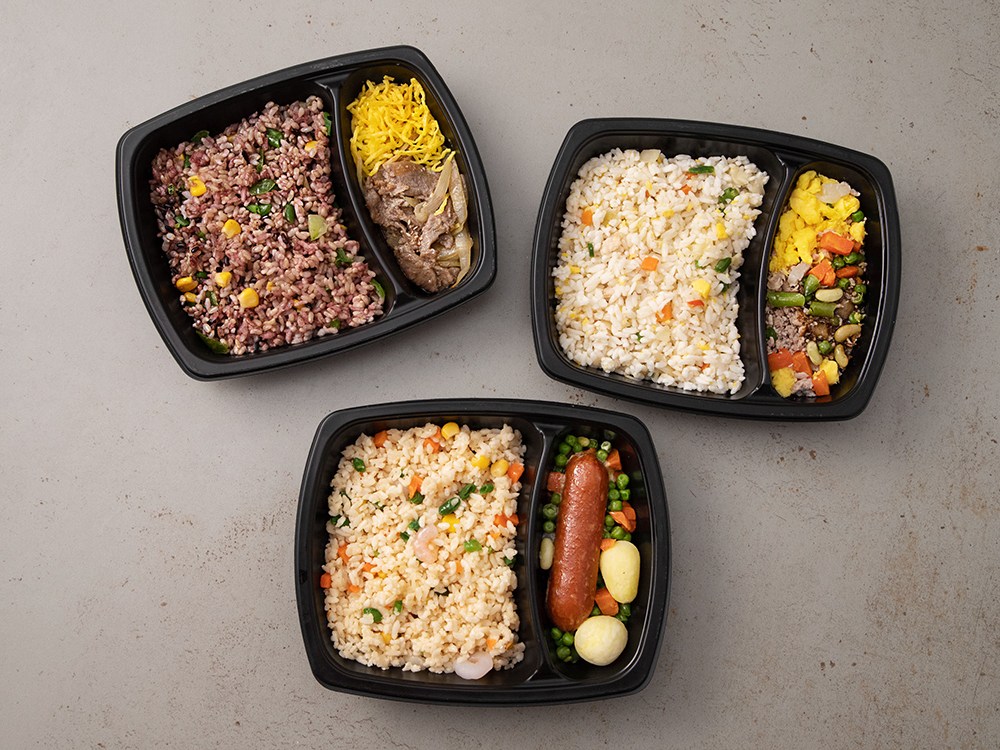현미 영양밥 & 소불고기, 새우 필라프 & 소시지와 알감자, 닭가슴살 볶음밥 & 무쌉 스크램블로 구성되어 있습니다.