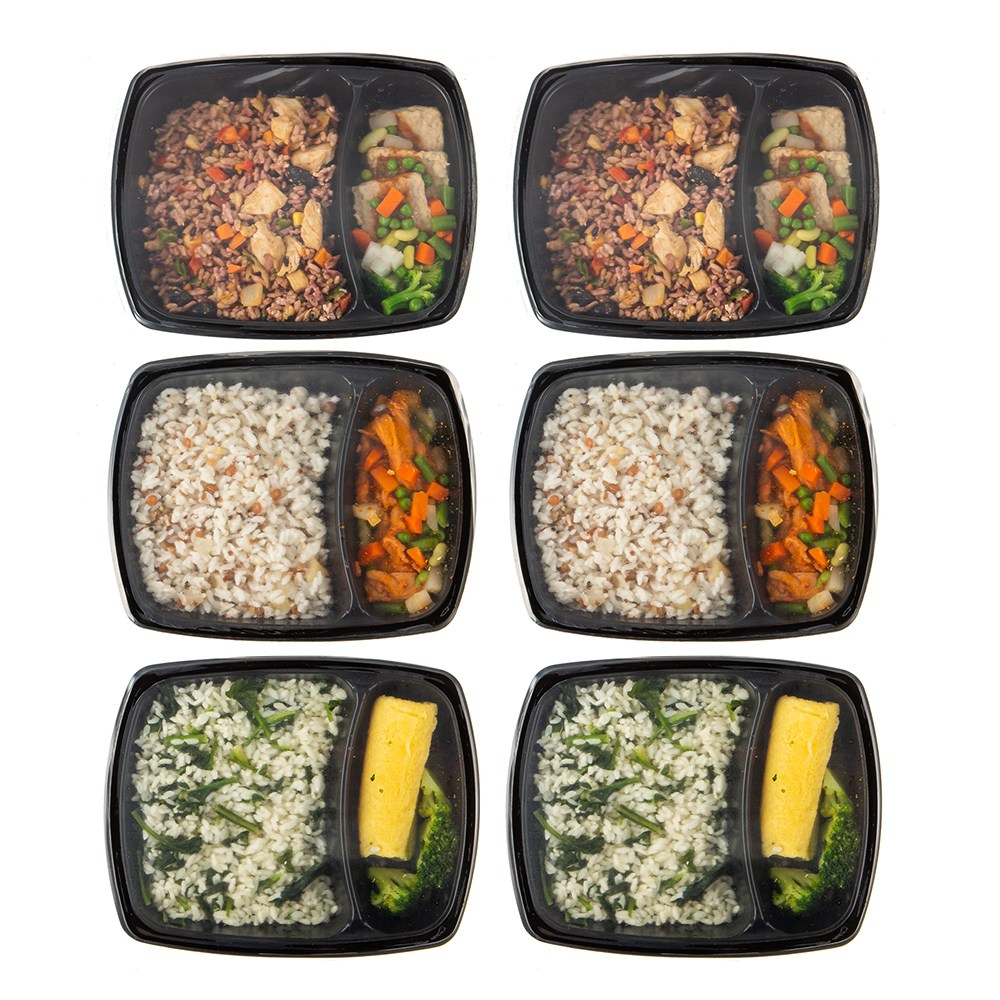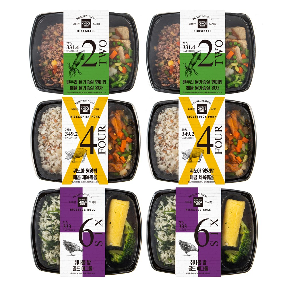 탄두리 닭가슴살 현미밥 & 해물 닭가슴살 완자, 퀴노아 영양밥 & 매콤 제육볶음, 취나물밥 & 골드 에그롤로 구성되어 있습니다.