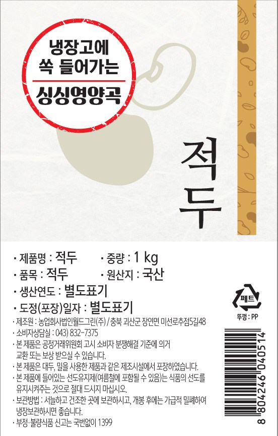 | 품목 또는 명칭 | 적두 | 포장단위별 내용물의 용량(중량),수량,크기 | 1kg |