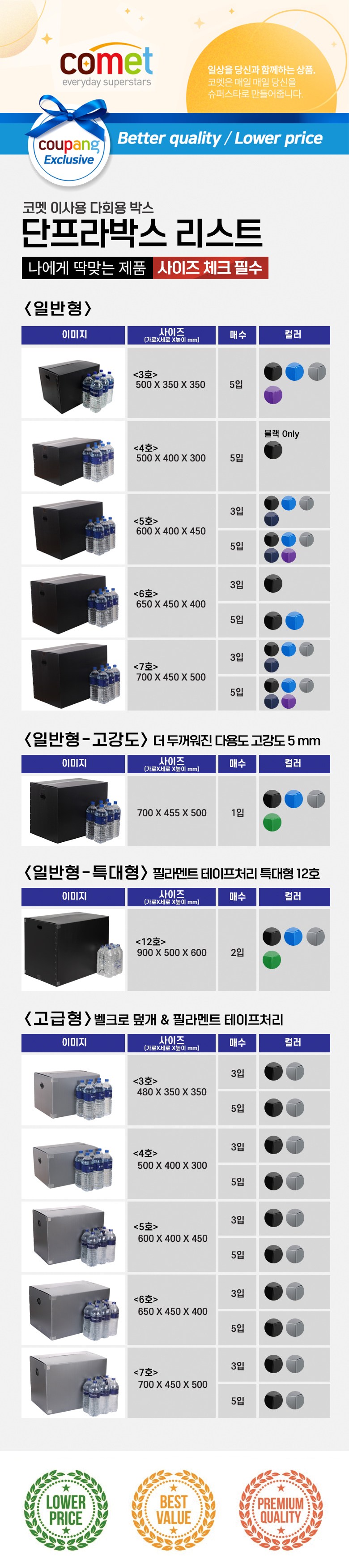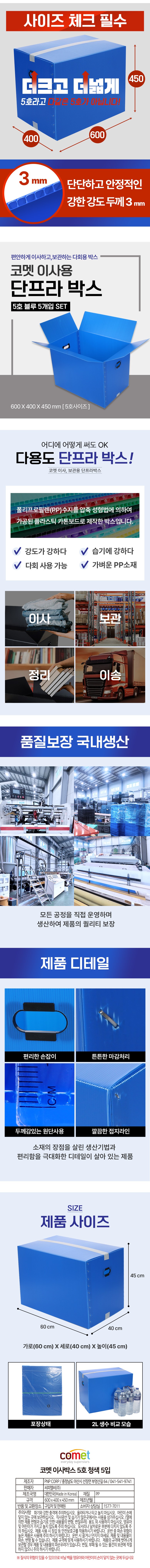 | 품명 및 모델명 | 코멧 이사박스 5호(600*400*450) 청색 5입 | 인증/허가 사항 | 해당없음 |