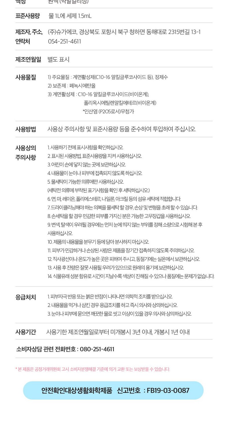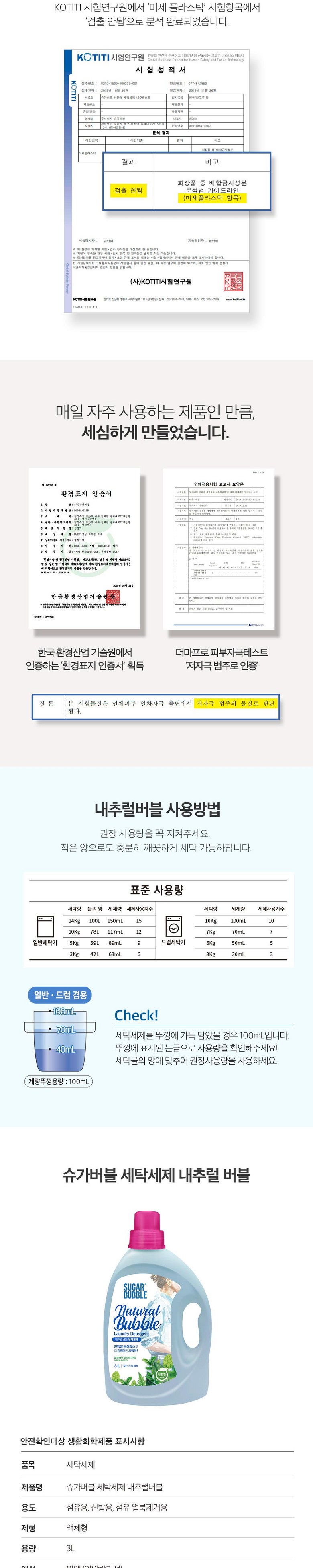 | 품목 및 제품명 | 슈가버블 친환경 세탁세제 내추럴버블 | 용도(표백제의 경우 계열을 함께표시) 및 제형 | 섬유얼룩 제거용, 신발용, 섬유용 / 액체형 |