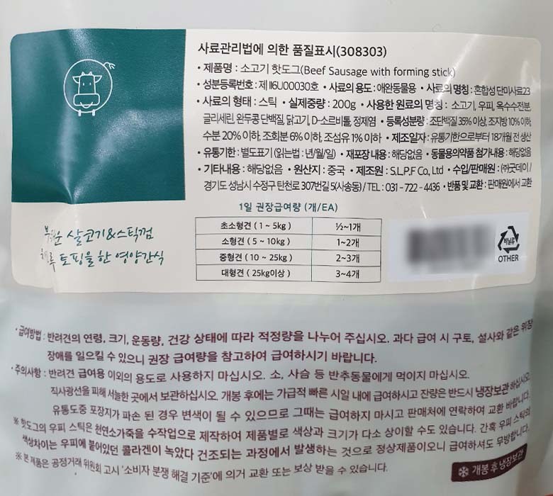 | 품명 및 모델명 | 소고기 핫도그 | 인증/허가 사항 | 사료관리법에 따른 성분등록번호 : 컨텐츠 참조 |