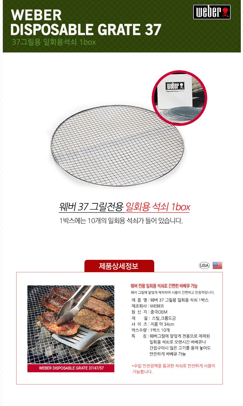 | 품명 및 모델명 | 웨버 37 그릴전용 일회용 석쇠 10개입 | 재질 | 스틸, 아연도금 |