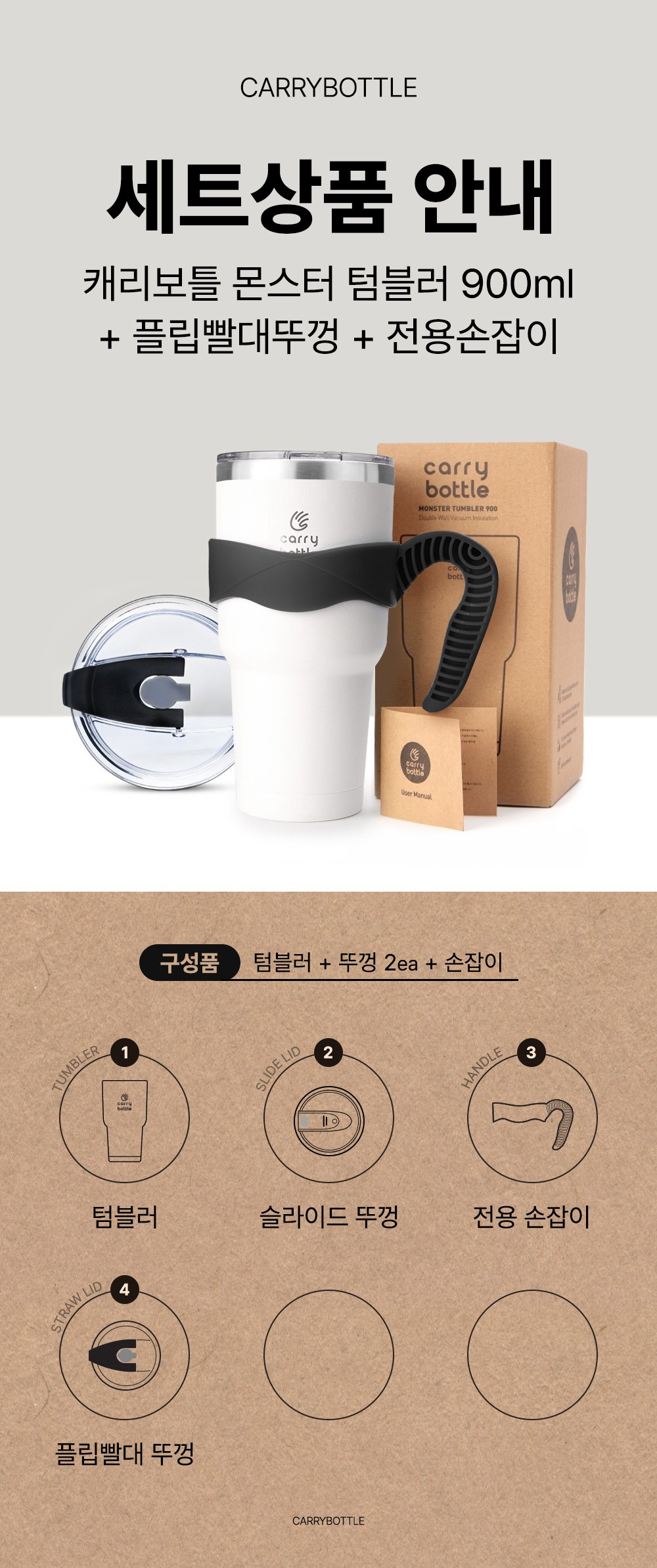 | 구성품 | 텀블러+기본뚜껑+플립빨대뚜껑+전용손잡이 | 크기 | 컨텐츠 참조 |