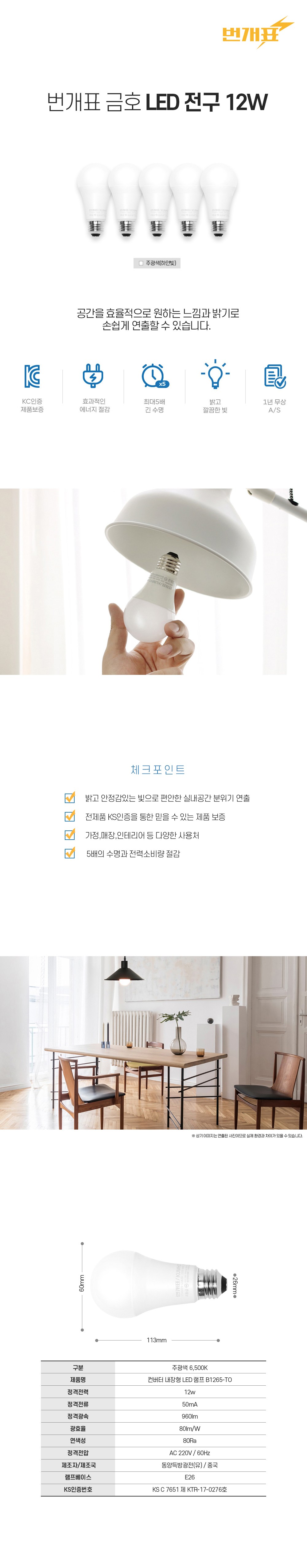 | 품명 및 모델명 | 번개표 LED 전구 12W / TP-KR-A60-12-WW | KC 인증정보 | KS C 7651 제 KTR-17-0276호 |