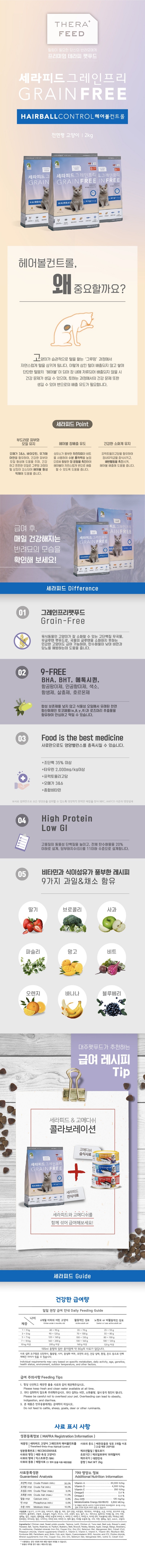 | 품명 및 모델명 | 세라피드 고양이 그레인프리 헤어볼 관리 | 인증/허가 사항 | 사료관리법에 따른 성분등록번호 : 컨텐츠 참조 |