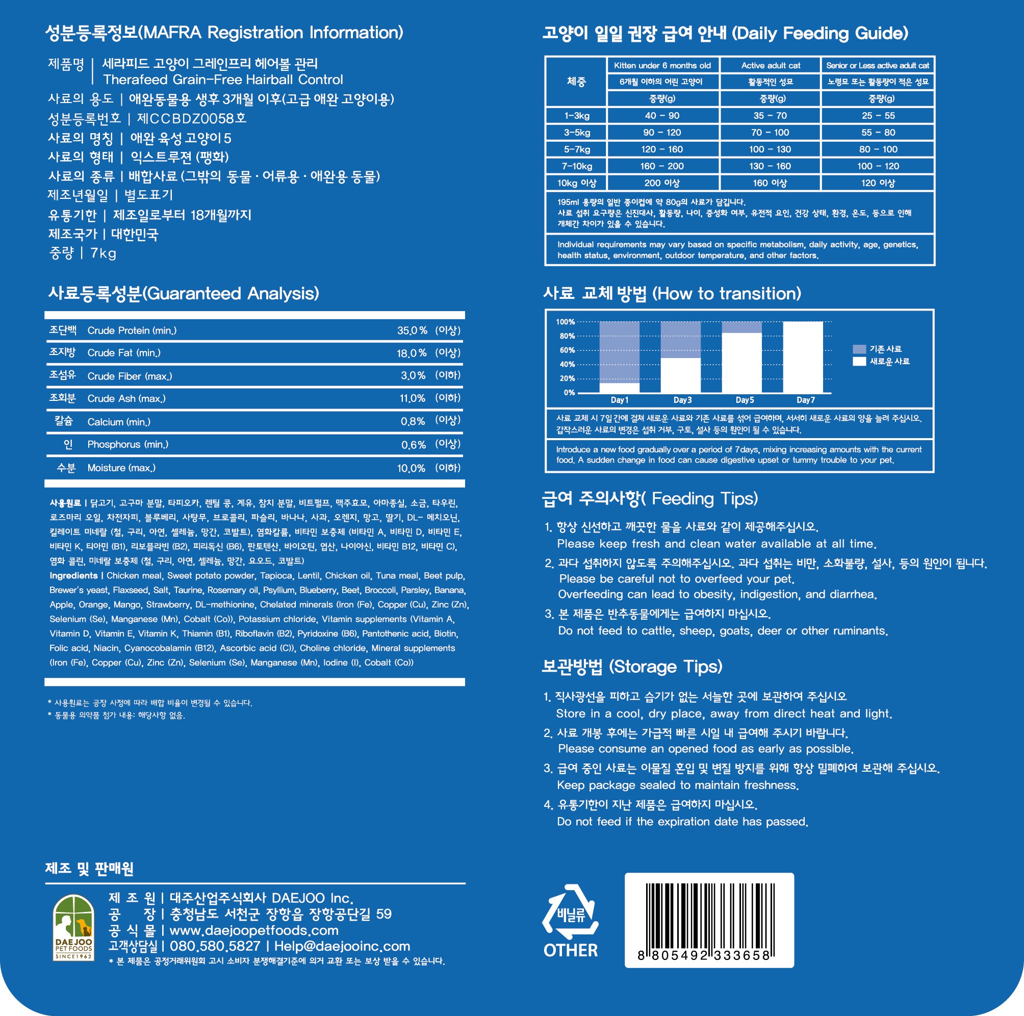| 품명 및 모델명 | 세라피드 고양이 그레인프리 헤어볼 관리 | 인증/허가 사항 | 사료관리법에 따른 성분등록번호 : 컨텐츠 참조 |