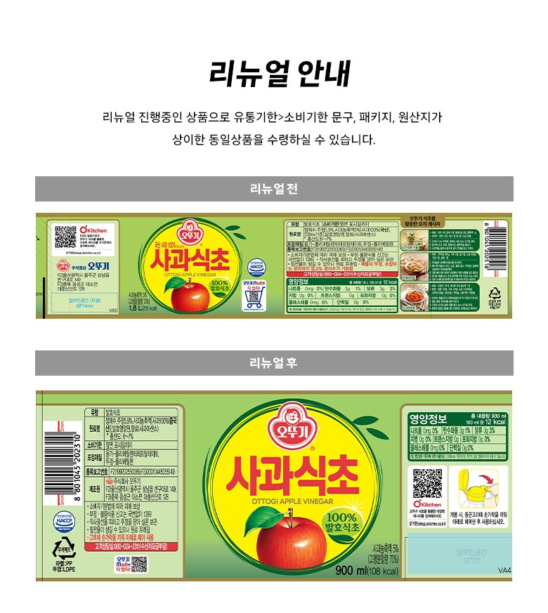 | 포장단위별 내용물의 용량(중량), 수량 | 900ml*15개 | 원재료명 및 함량 | 리뉴얼 전, 후 : 컨텐츠 참조 |