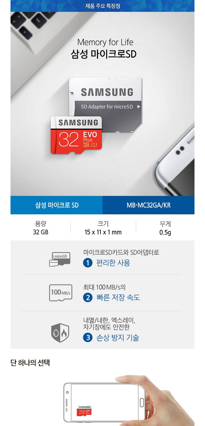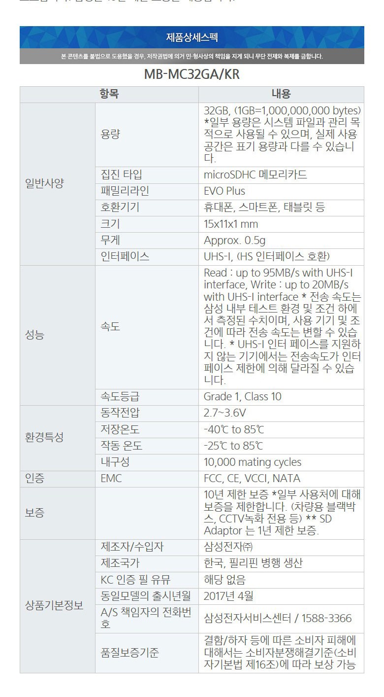 | 품명 및 모델명 | 마이크로SD카드 EVO PLUS 32G MB-MC32GA/KR, 32GB | 인증/허가 사항 | 해당없음 |
