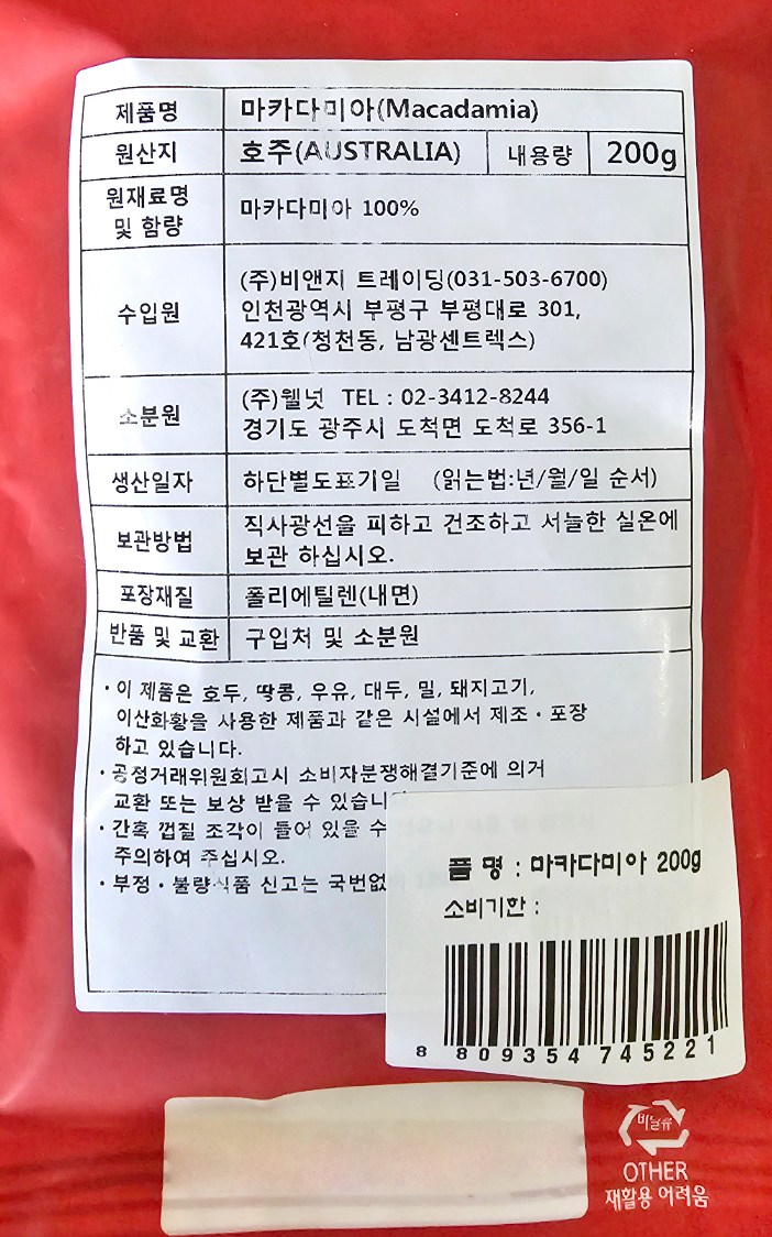 | 품목 또는 명칭 | 마카다미아 | 포장단위별 내용물의 용량(중량),수량,크기 | 200g x 1개 |