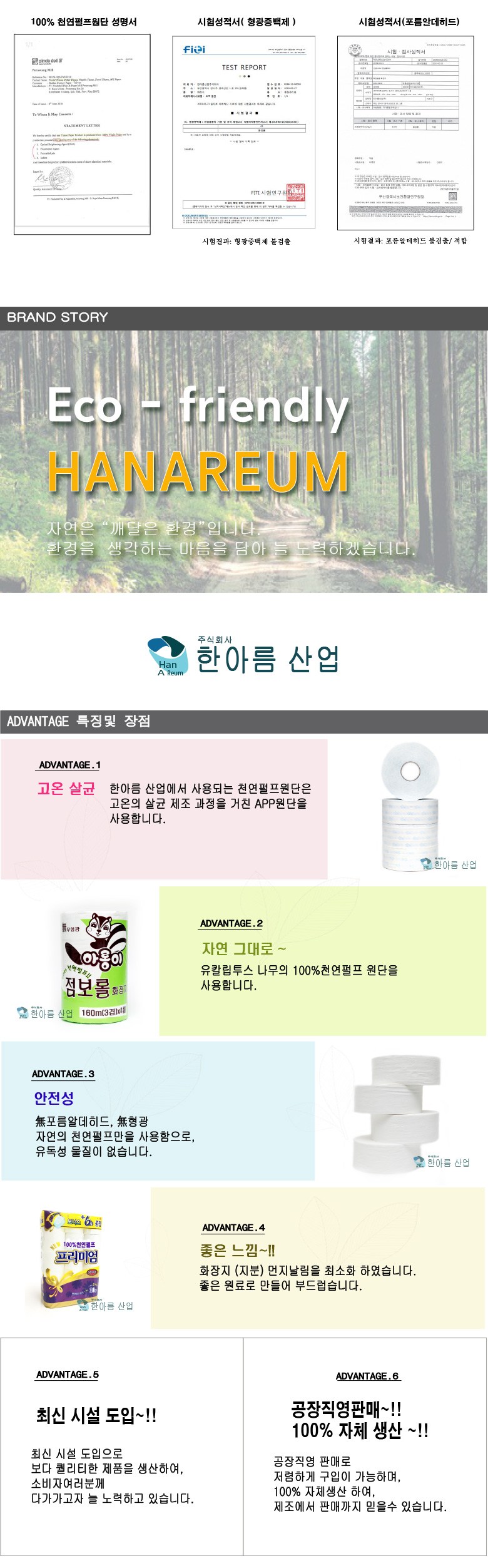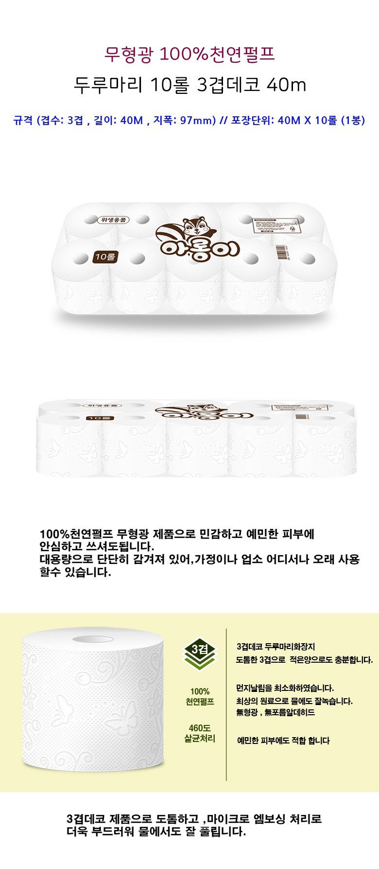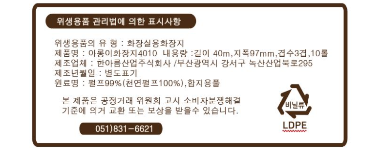 | 품명 및 모델명 | 한아름산업 100%천연펄프 아롱이 화장지 3겹 40M 10롤 | 인증/허가 사항 | 상품 상세페이지 참조 |