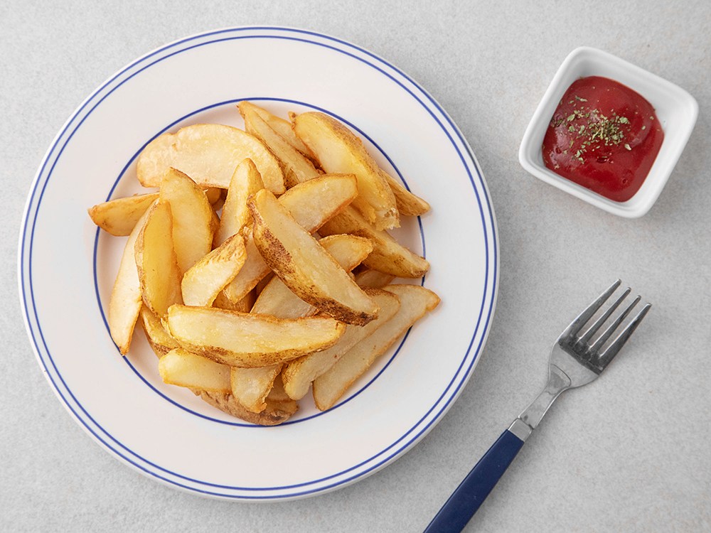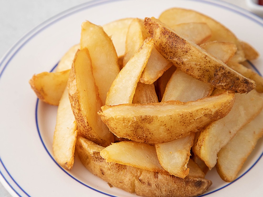 튀김기에 적당량의 기름을 붓고 180℃ 정도로 가열한 후 웨지컷을 넣고 3~5분간 노릇노릇하게 튀겨주세요.