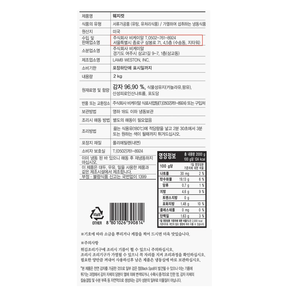 | 생산자 및 소재지 | LAMB WESTON. INC. / f1:주식회사비케이알, 경기도 여주시 삼교1길 9-7, 1층(삼교동) / F2 : 주식회사 비케이알, 경기도 안성시 일죽면 죽화로 139-1, 가동 1층 | 소비기한 또는 품질유지기한 | 소비기한(또는 유통기한) : 2026년 12월 01일 이거나 그 이후인 상품 |