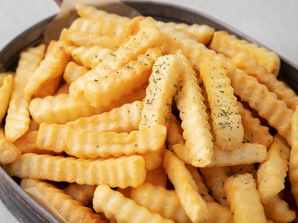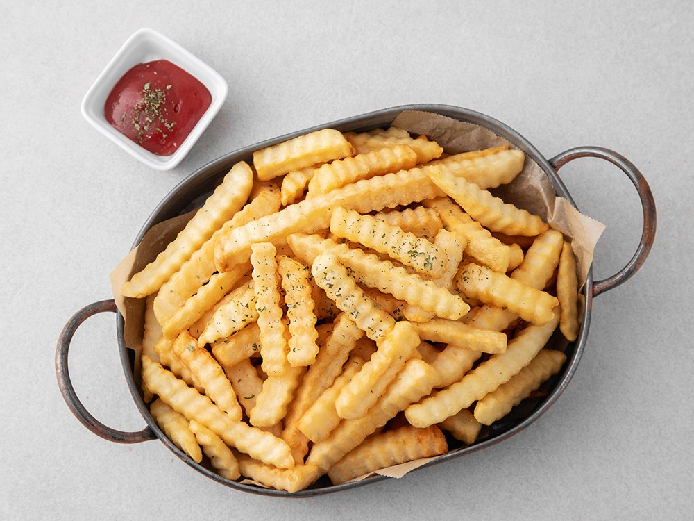 튀김기에 적당량의 기름을 붓고 180℃ 정도로 가열한 후 크링클컷을 넣고 3~5분간 노릇노릇하게 튀겨주세요.
