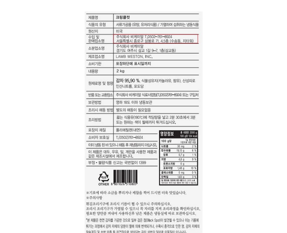 | 생산자 및 소재지 | LAMB WESTON. INC. / f1:주식회사비케이알, 경기도 여주시 삼교1길 9-7, 1층(삼교동) / F2 : 주식회사 비케이알, 경기도 안성시 일죽면 죽화로 139-1, 가동 1층 | 소비기한 또는 품질유지기한 | 소비기한(또는 유통기한) : 2026년 11월 10일 이거나 그 이후인 상품 |