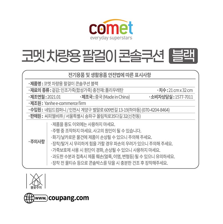 | 품명 및 모델명 | 코멧 차량용 팔걸이 콘솔쿠션 | 인증/허가 사항 | 해당없음 |