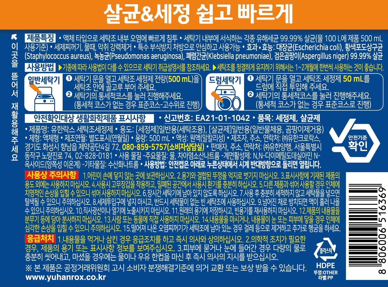 | 품목 및 제품명 | 세정제,살균제 / 유한락스 세탁조세정제 | 용도(표백제의 경우 계열을 함께표시) 및 제형 | [세정제]일반용-세탁조용, [살균제]일반용(일반물체용,곰팡이제거용) / 액체형 |