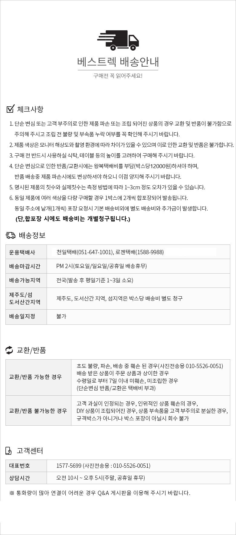 - ㆍ교환/반품에 관한 일반적인 사항은 판매자가 제시사항보다 관계법령이 우선합니다.