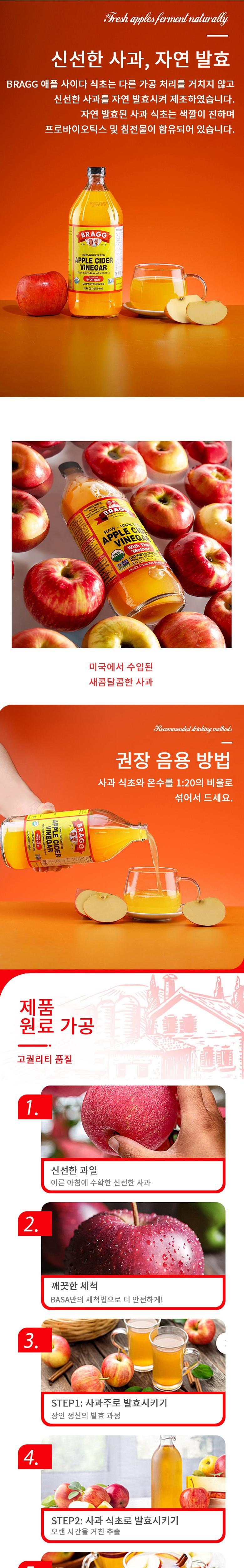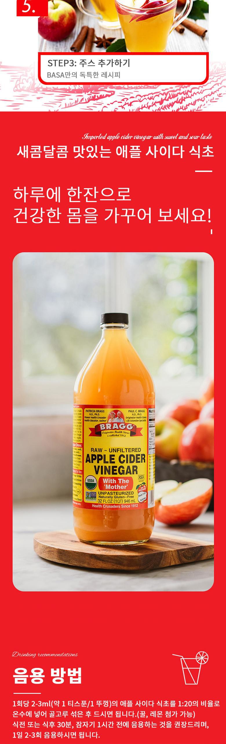신선한 사과을 수확하여 BASA만의 세척 방식으로 깨끗히 세척한 후, 자연 발효하여 제작하였습니다. 비타민 C 및 프로바이오틱스가 함유되어 있습니다. 자연 발효 특성상 식초 색상이 다소 진하고, 침전물이 있습니다.
