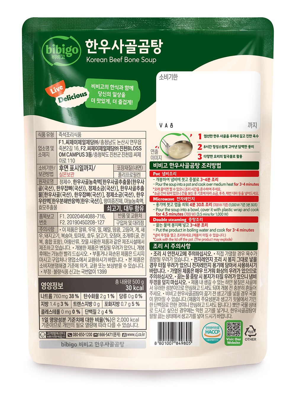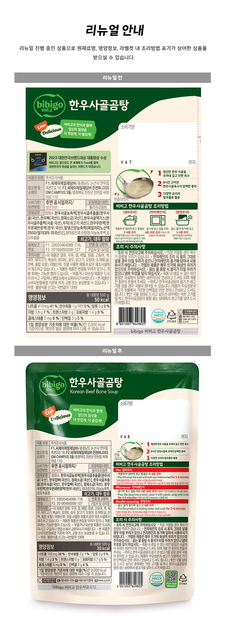 | 제품명 | bibigo 비비고 한우사골곰탕 | 식품의 유형 | 컨텐츠 참조 |