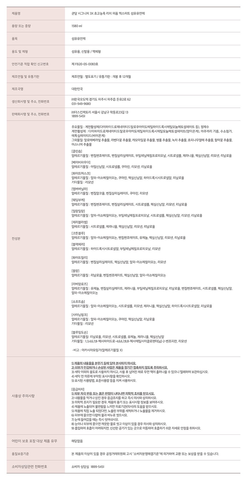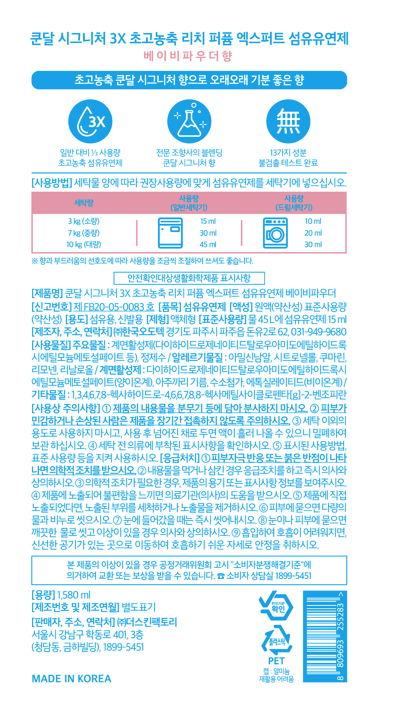 | 품목 및 제품명 | 섬유유연제 / 쿤달 시그니처 3x 초고농축 리치 퍼퓸 엑스퍼트 섬유유연제 베이비파우더 | 용도(표백제의 경우 계열을 함께표시) 및 제형 | 신발용,섬유용 / 비분사형-액체형 |
